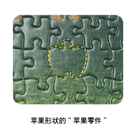 苹果零件 出于希望客人尽兴,以及使组装过程充满想象力的想法,苹果一独创了拼图零件中有一个零件为苹果形状的拼图造型。在大量有着相似形状的零件中,这个有着独特形状的零件也将成为提示。 塑料拼图、棋盘拼图和120块拼图没有。 关于产品