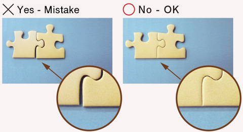 Assemble separate puzzle sections. Fit remaining pieces accordingly. For unpatterned areas of the color, fit pieces by trial and error.